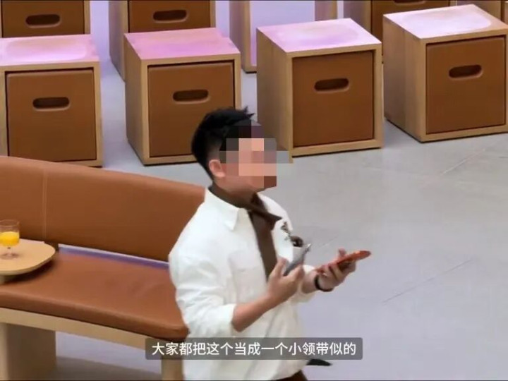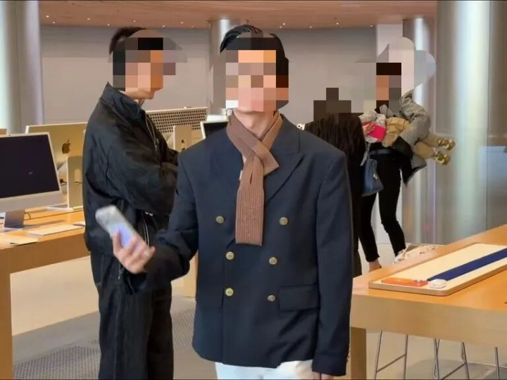 有小哥穿着褐色外套,搭配蓝色长款iPhonePocket;
